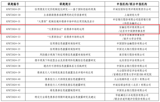 公司近日从中国银行间市场交易商协会获悉,在协会2024年度“NAFMII研究计划”立项名单中,安融评级与中央财经大学中国财政发展协同创新中心及北京市中闻律师事务所分别联合申报的课题,《化债背景下城投公司转型发展路径研究》和《“大男孩协议”在债券市场的运用》均位列其中,获得立项。