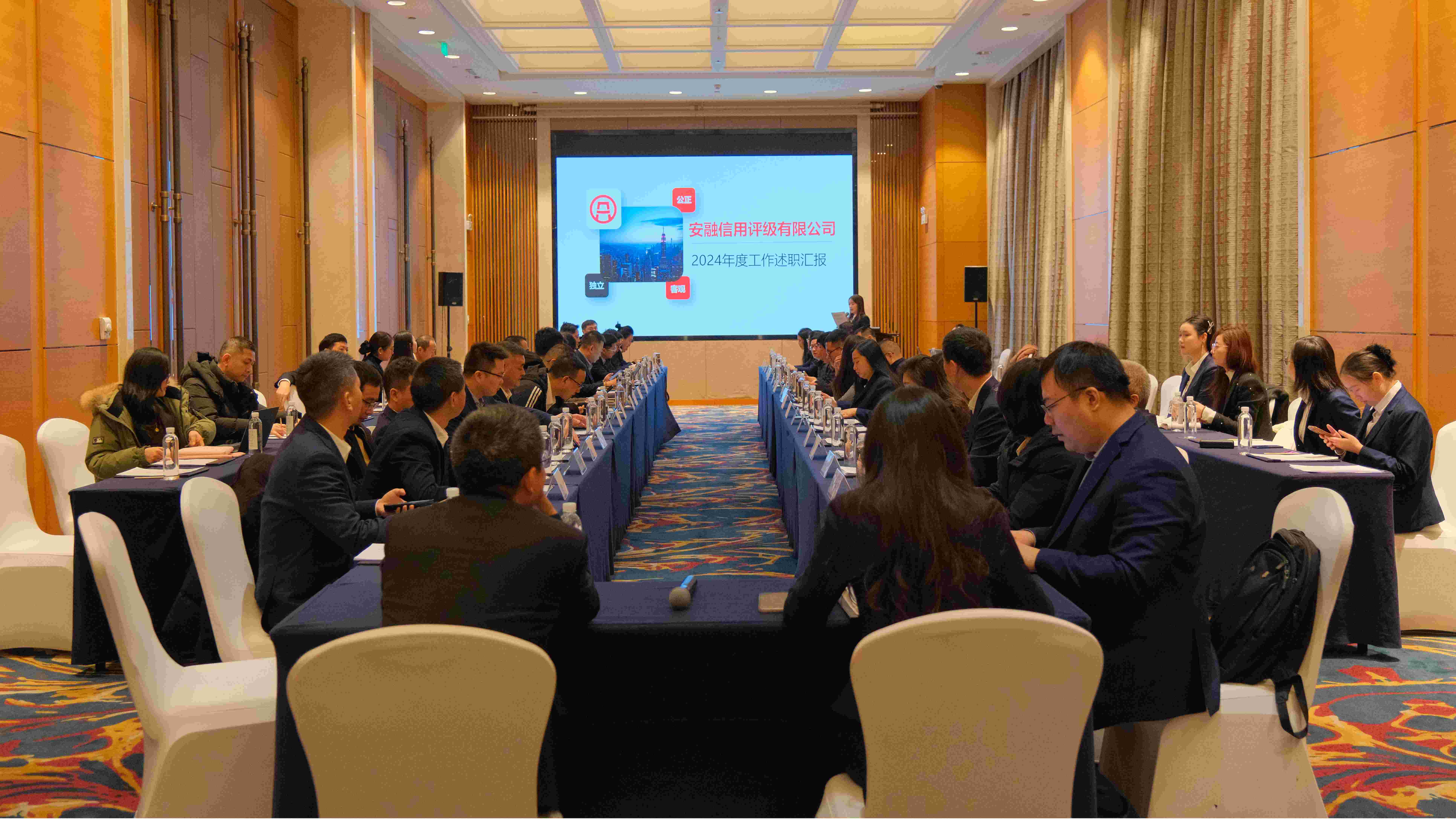 2025年1月11日-12日,安融信用评级有限公司于北京古北水镇召开了2024年度总结述职暨2025年度计划工作会。会议全面回顾总结了2024年经营和管理中的工作亮点和成绩,查找不足,并部署2025年各业务条线的任务目标,为新一年的高质量发展谋篇布局。会议由人力资源部总经理王世超主持,公司经营班子全体成员,各部门和分子公司(办事处)负责人及业务骨干共六十余人参会。