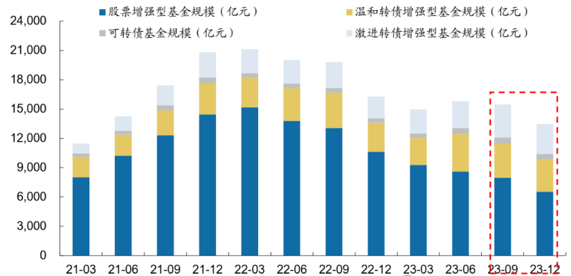 中国境内四种类型的固收+基金规模(2021年-2023年)