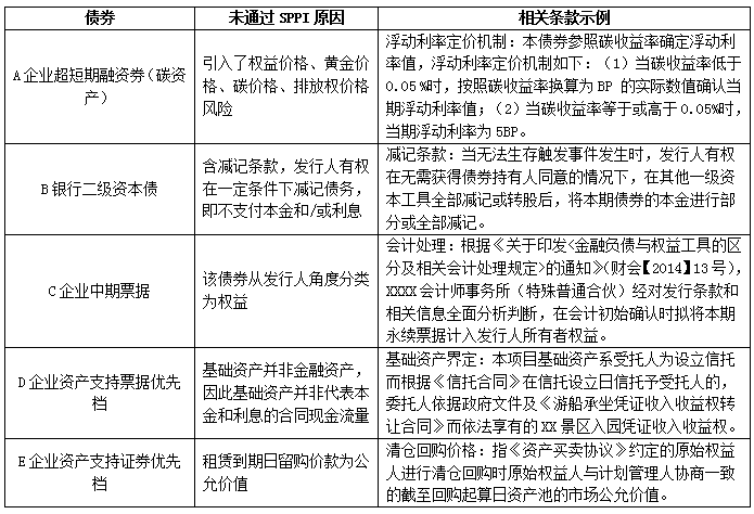 中国部分未通过SPPI债权类资产的原因及相应条款示例(截至2022年12月31日)