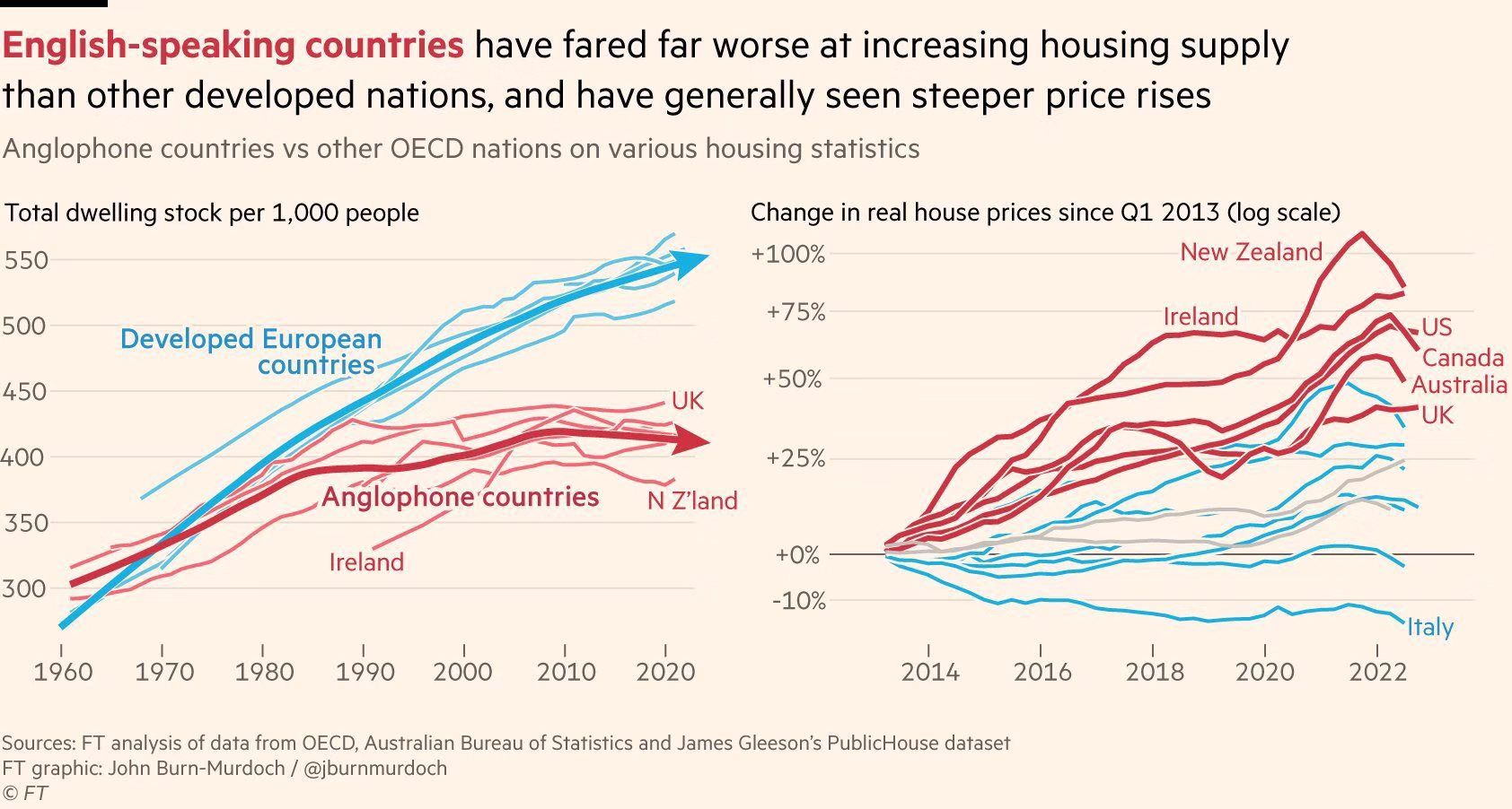 英语国家和非英语国家房屋供给和房价走势(1960年-2022年)